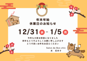 いつもSalon de Bon chicをご利用いただきありがとうございます。年末年始の営業についてお知らせいたします。 年末年始の営業日程 12月27日 土曜日 営業12月28日 日曜日 休み12月29日 月曜日 営業 […]